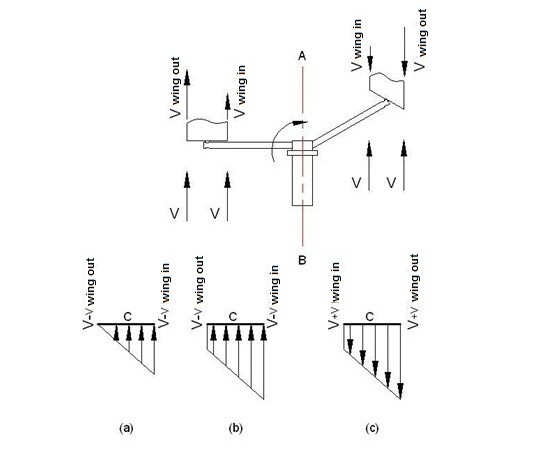 If we take Figure 7 into consideration, on the left side of the AB axis the wings rotates in the same direction with the wind and on the right side of the AB axis the wings rotates in the opposite direction of the wind. Again during the circular movement the linear velocity of the outer edge and the inner edge of the wing will be different. Due to the circular movement, the velocity at the outer edge of the wing is great but the velocity at the inner edge is less. The velocity at the wing surface positions that change depending on the distance between the wing surface and the center is in the same direction for the left part of the AB axis and the velocity values which are relative depending on the speed of the wind again will vary throughout the wing surface. Therefore the force to be generated on the surface will be different depending on the speed of the wind, the distance of one point on the wing to the center and also on the number of cycles.