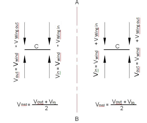 For the conditions Figure 8-a / 8-b / 8-c, Area = A = 1/2 ( Vw.out + Vw.in ) C is obtained. And if Vmed expression is used for the speed of wind effecting momentarily on the surface of the wing,